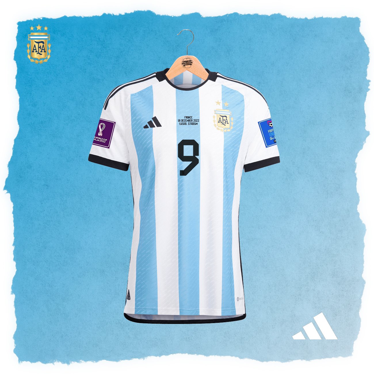 Características: Casaca local de Argentina, usada en el Mundial Qatar 2022. Incluye el dorsal de #9 de J. ALVAREZ y matchday de la final.