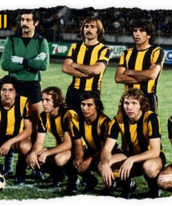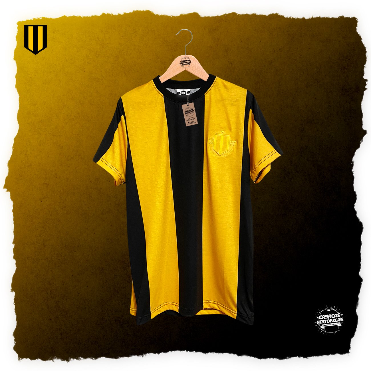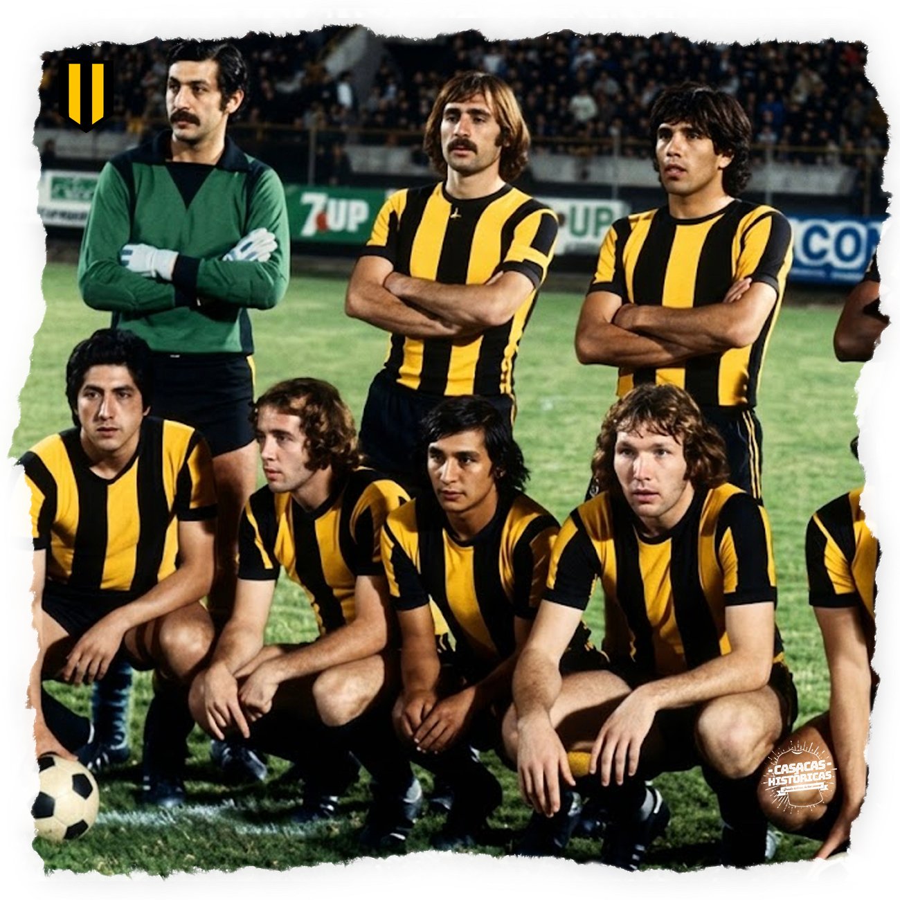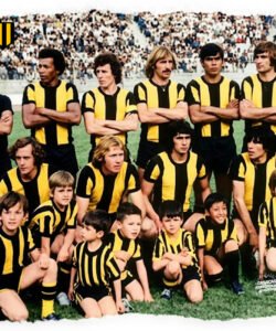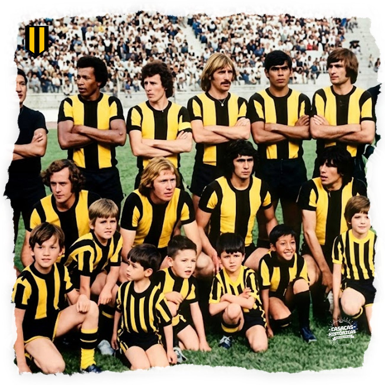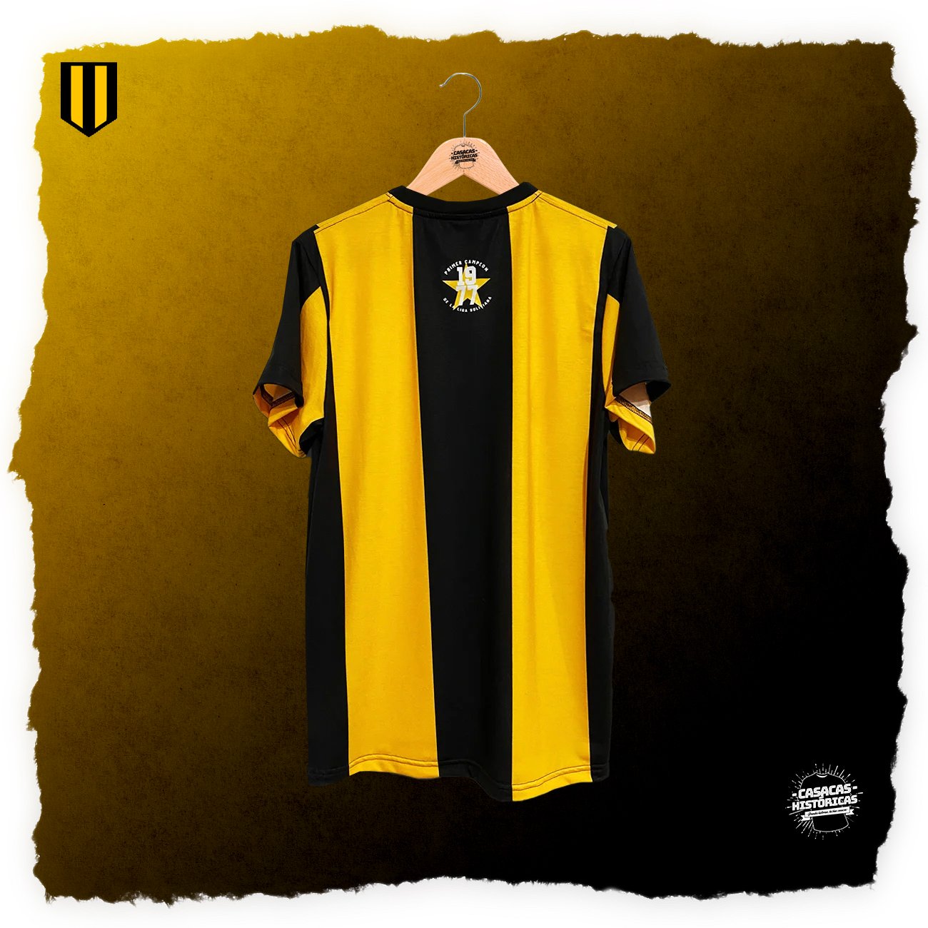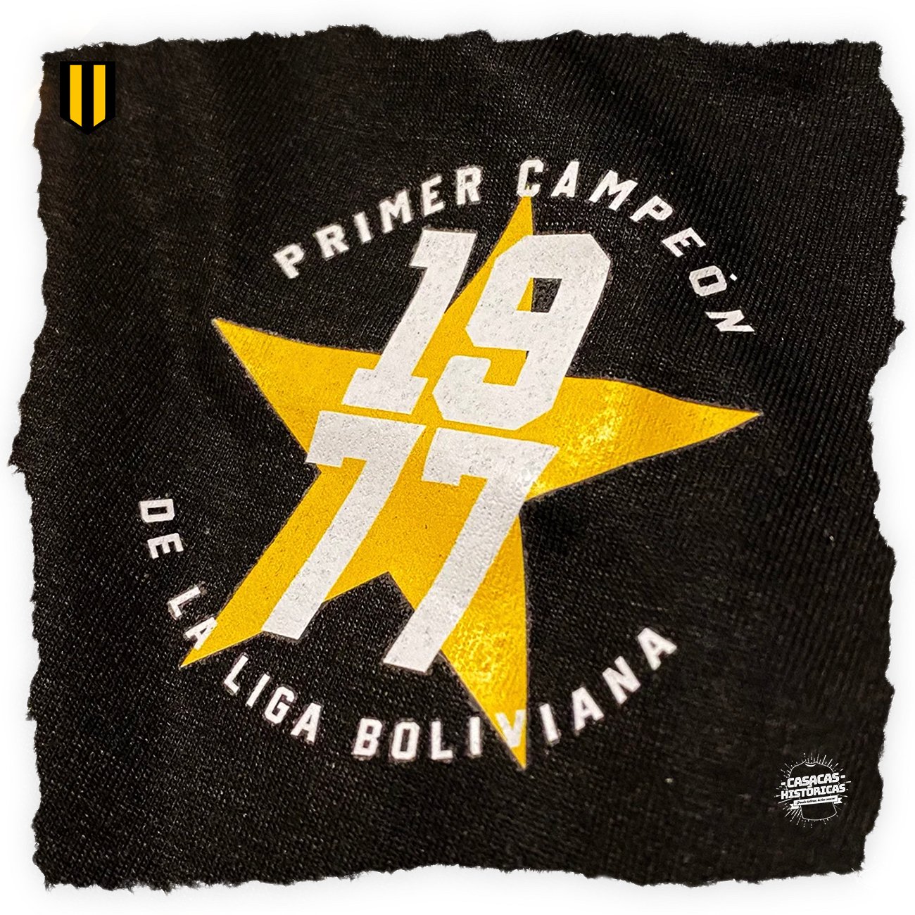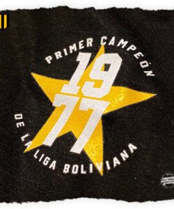 La casaca con la que el club Aurinegro paceño gritó campeón en 1977, en el primer torneo organizado por la Liga Profesional de Fútbol Boliviano. Hecha por: CASACAS HISTÓRICAS Jugadores que vistieron este modelo: Fontana, Iriondo, Galarza