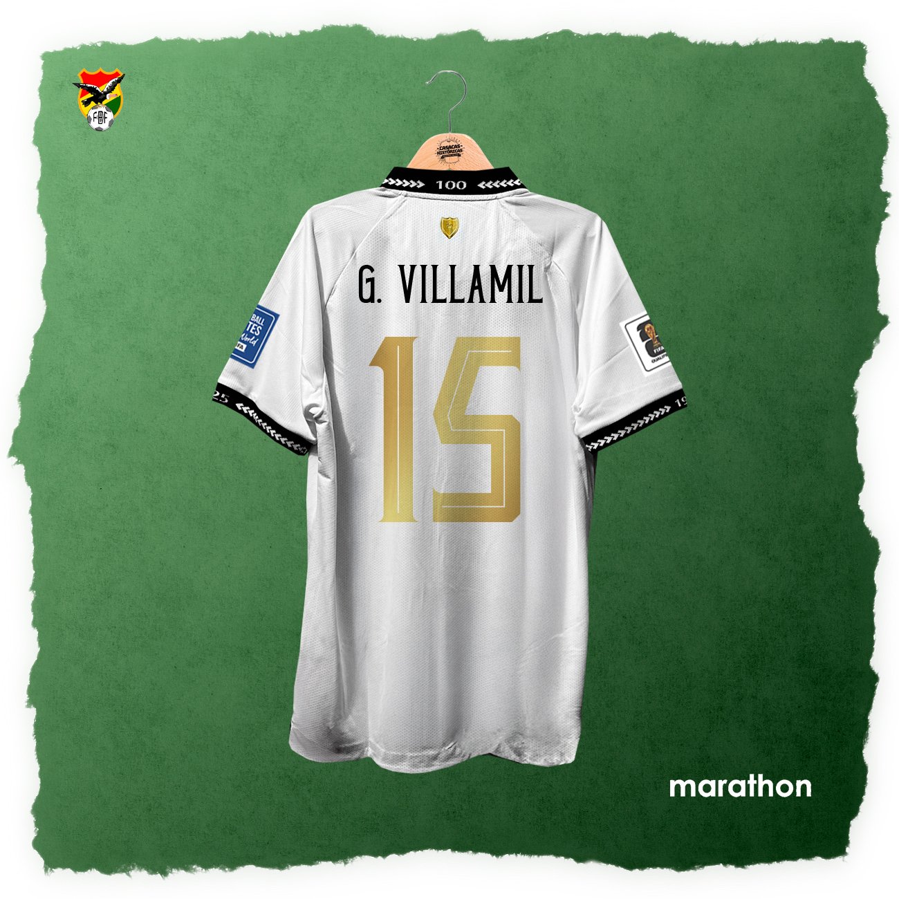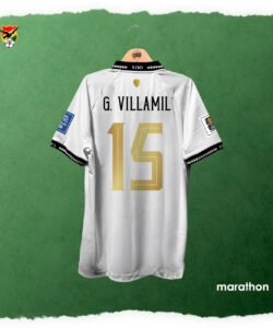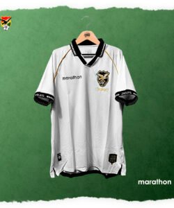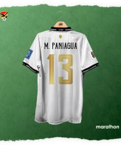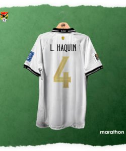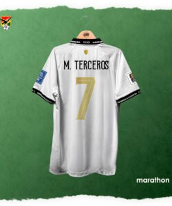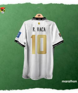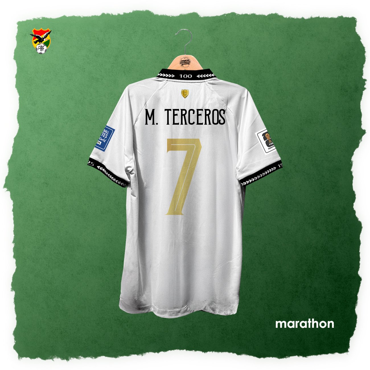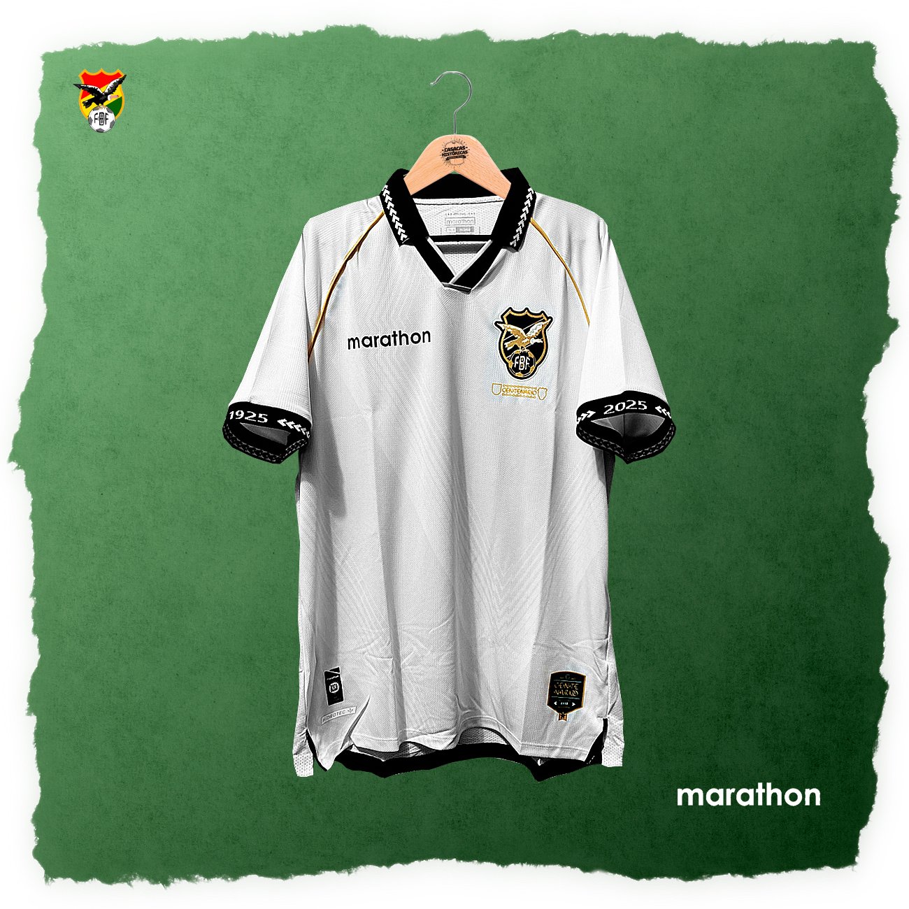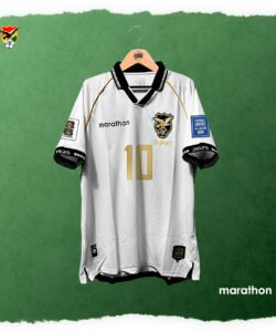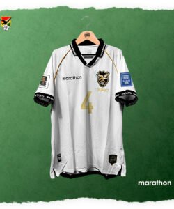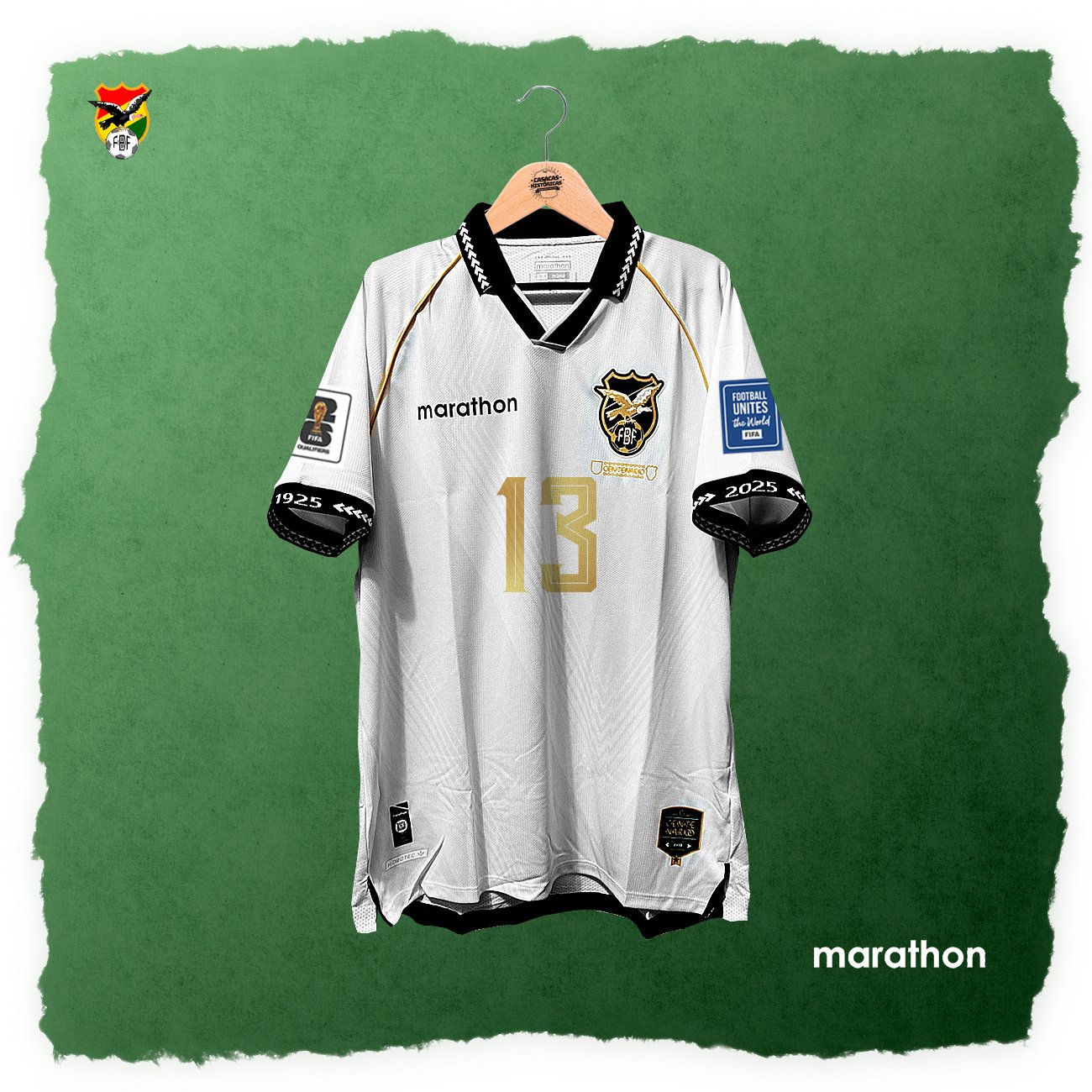 Características: Casaca de Bolivia, usada en la temporada 2025, edición especial limitada que celebra los 100 años de la FBF. Presenta un color verde oscuro, con una trama de plumas de cóndor, combinado con dorado. Incluye un detalle al reverso del escudo, que conmemora a los campeones de la Copa América 1963, parches de las Eliminatorias al Mundial 2026 y dorsal del jugador.