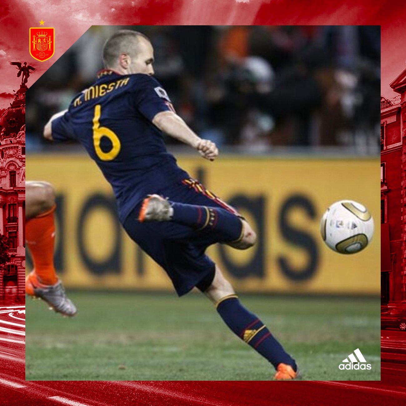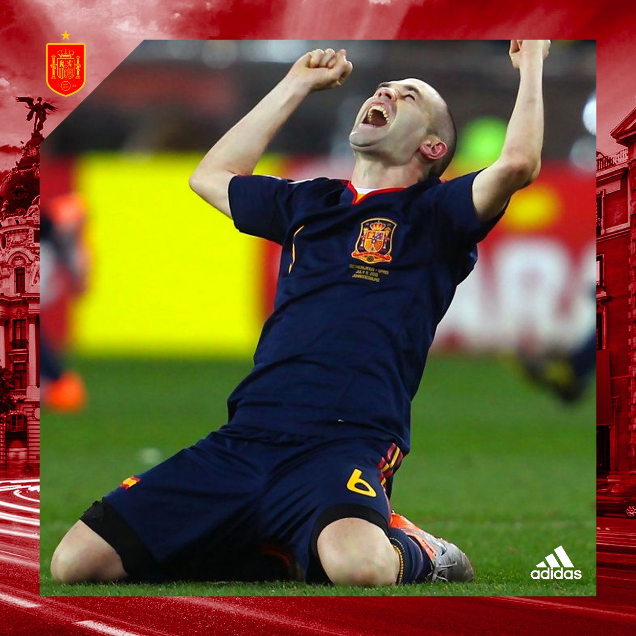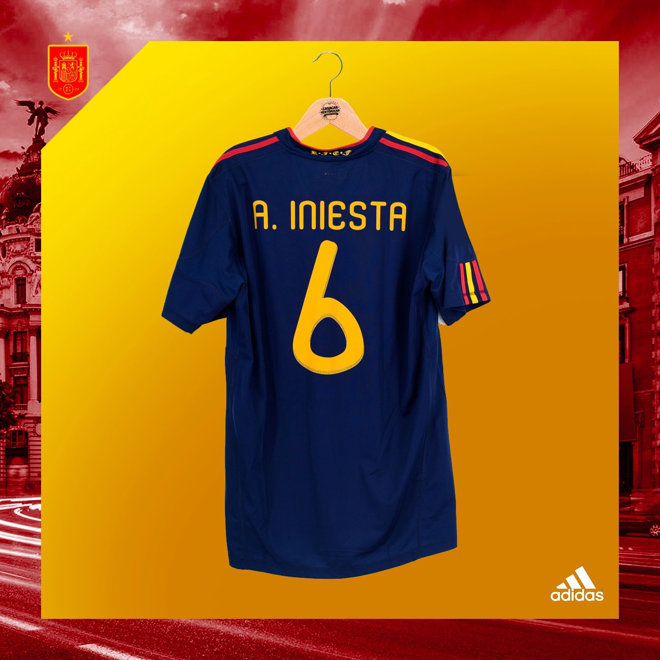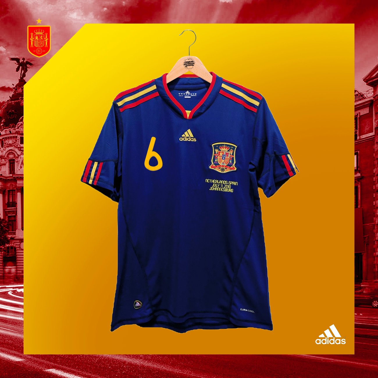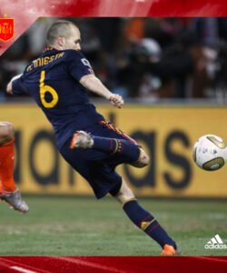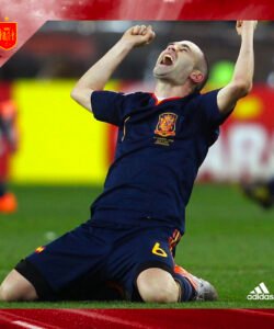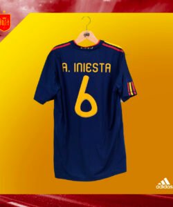 Casaca de España, usada en la final del Mundial Sudáfrica 2010, en la que Andrés Iniesta le dio la victoria al cuadro español. Talla L. Hecha por Adidas. Incluye el dorsal #6 de INIESTA y la inscripción del partido final. Jugadores que usaron esta casaca: Iniesta, David Villa, Puyol, Xavi, Xabi Alonso