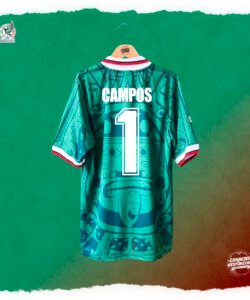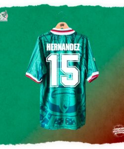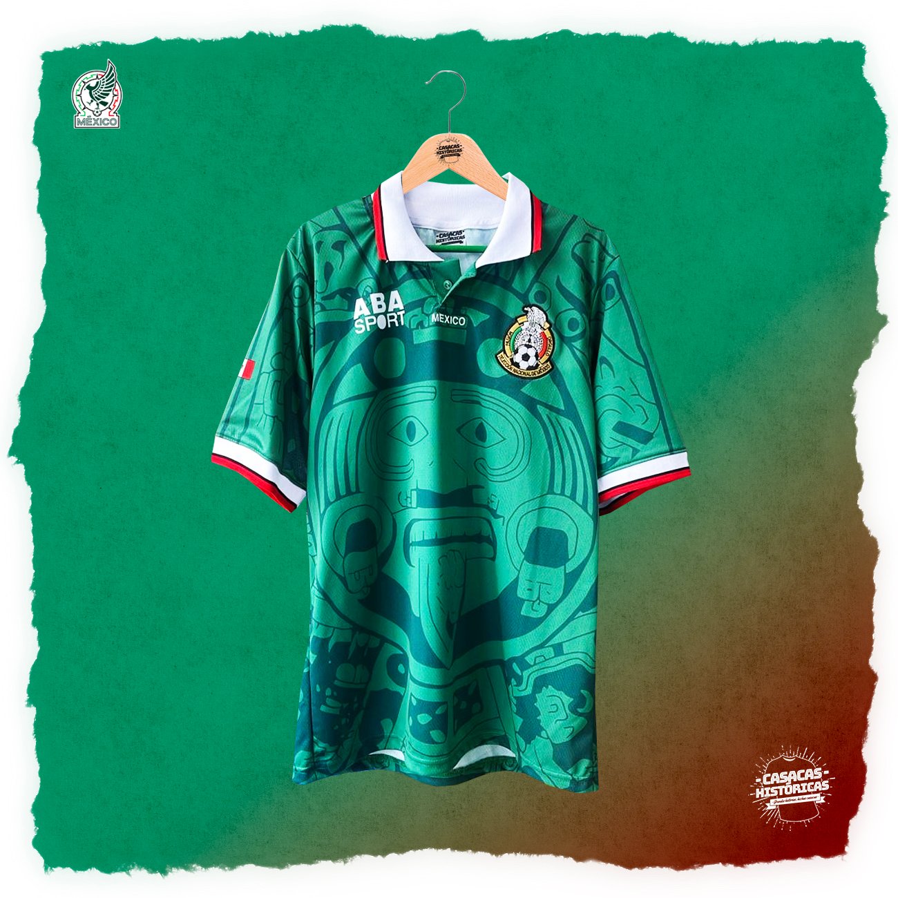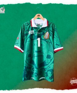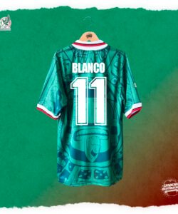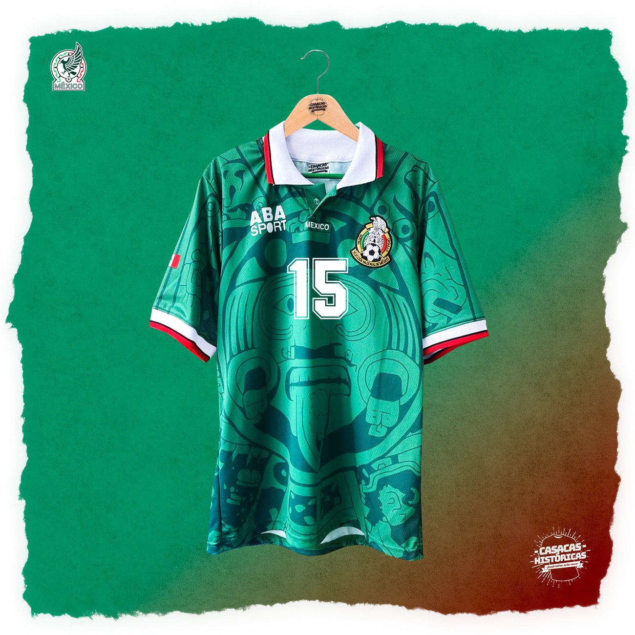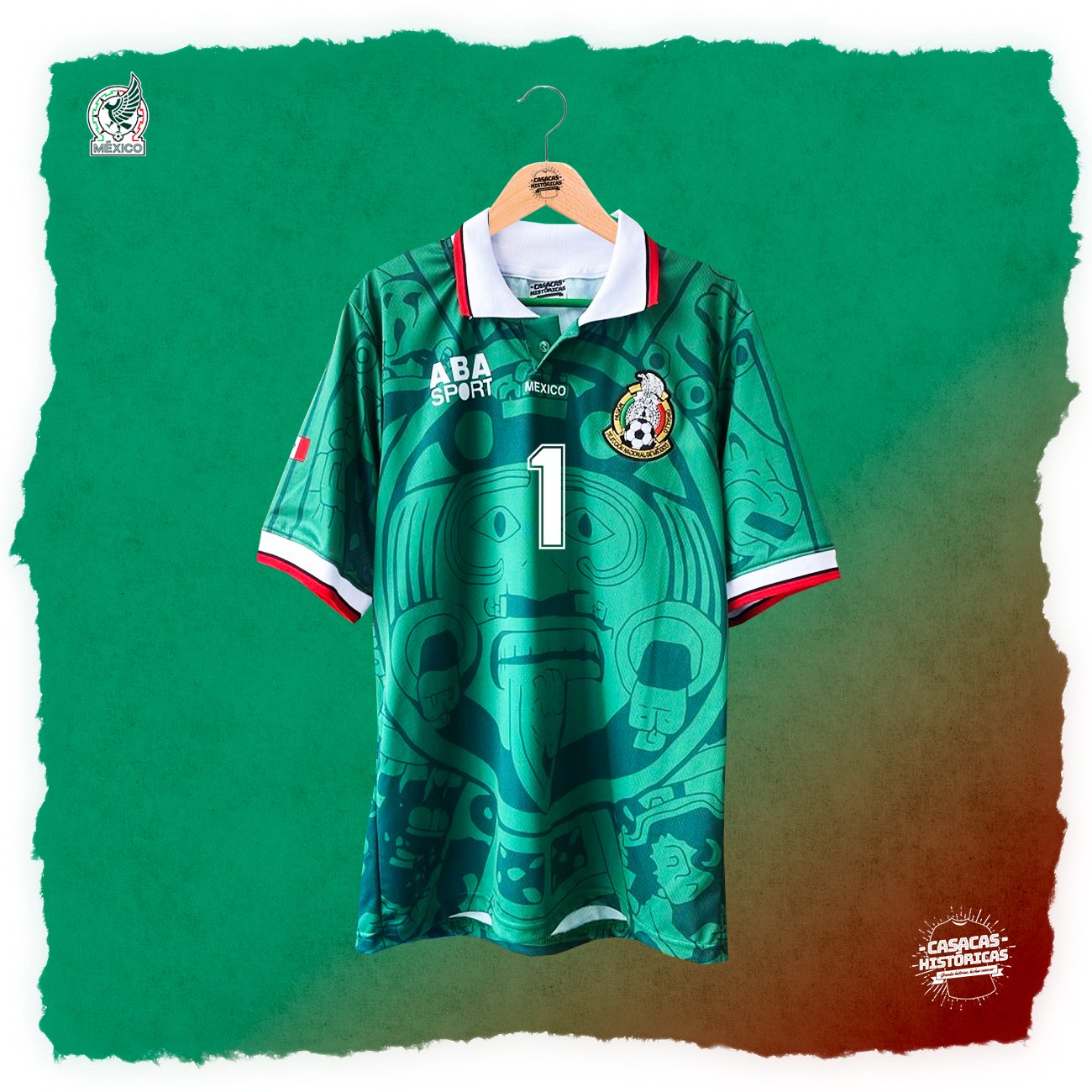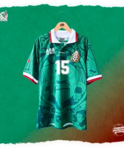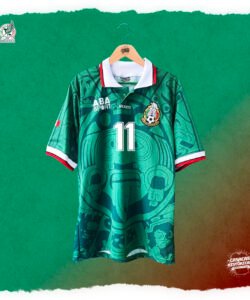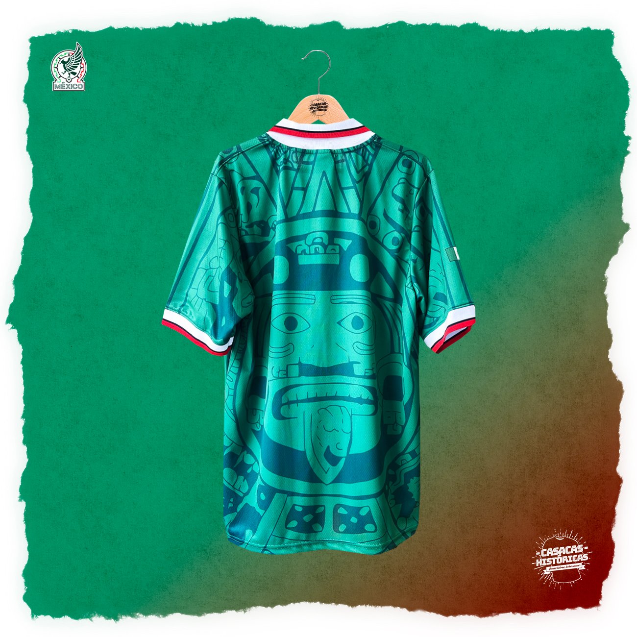 Características: Casaca de México, usada en el mundial Francia 1998. Diseño icónico que muestra el Calendario Maya en toda la camiseta, quizás la camiseta más reconocida de la selección mexicana. Incluye el dorsal del jugador.