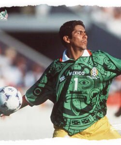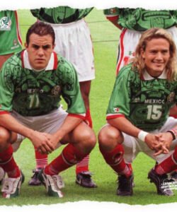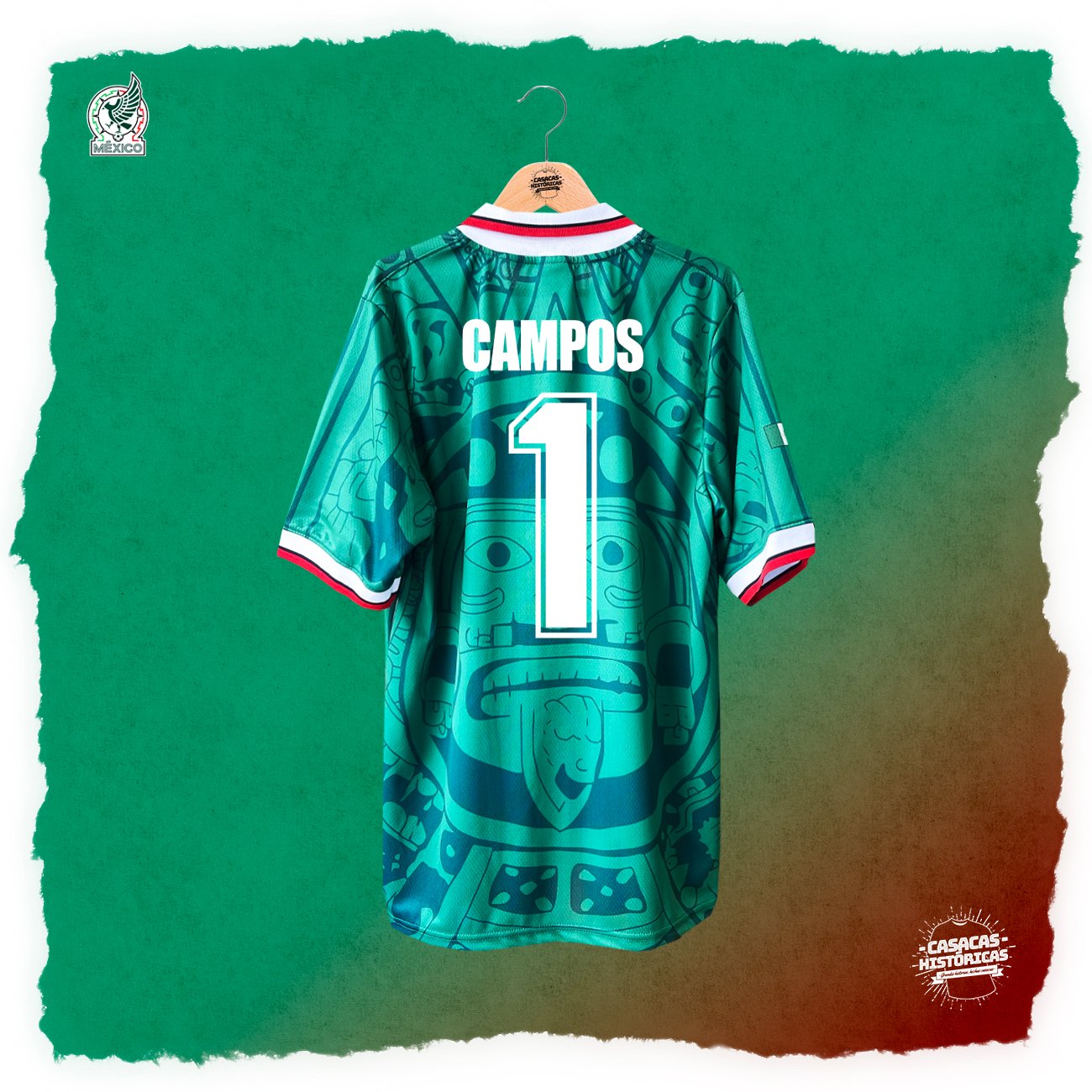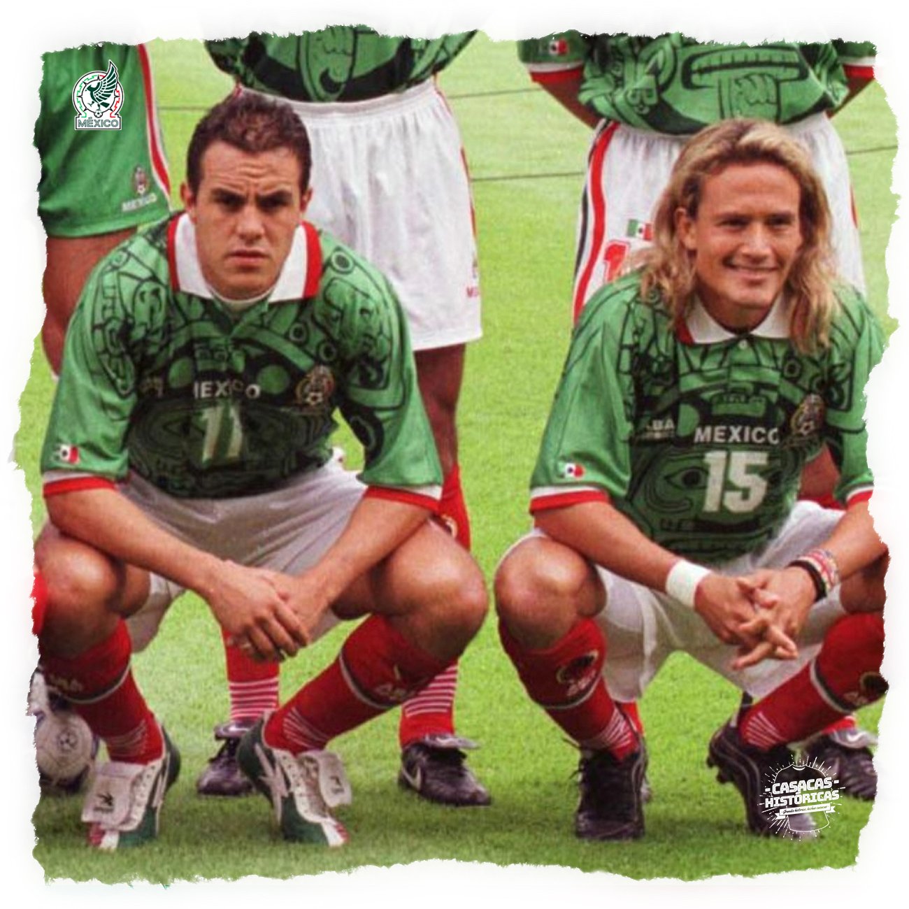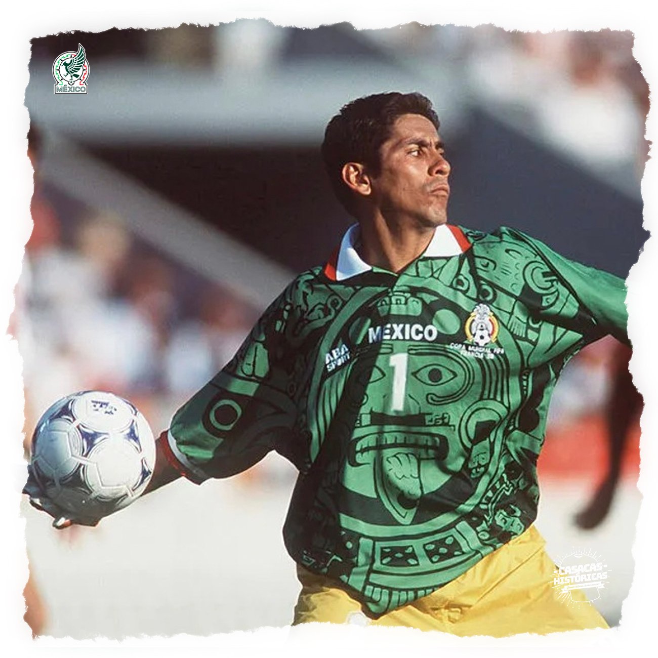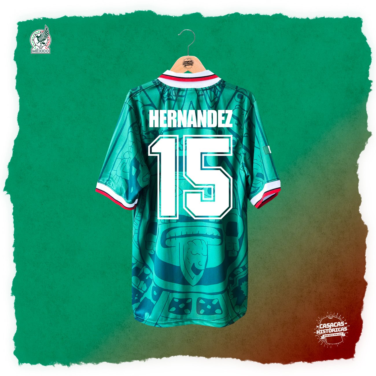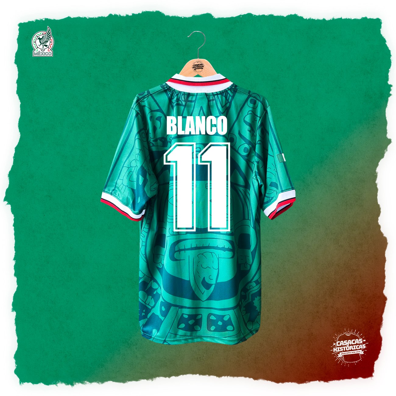 Características: Casaca de México, usada en el mundial Francia 1998. Diseño icónico que muestra el Calendario Maya en toda la camiseta, quizás la camiseta más reconocida de la selección mexicana. Incluye el dorsal del jugador.