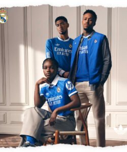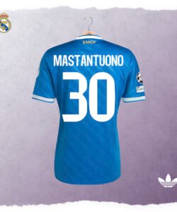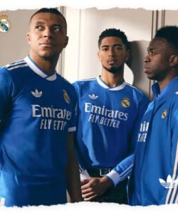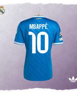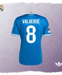 Características: Casaca del Real Madrid, usada en la temporada 2025/26. Usa el color azul en referencia a las tribunas del estadio Santiago Bernabéu. Incluye los parches de Champions League y dorsal del jugador.
